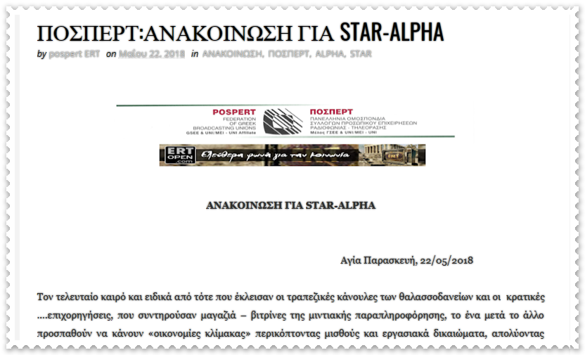 Πριν ακόμα ολοκληρωθεί το "συνοικέσιο" STAR- ALPHA  εμείς  τα λέγαμε,  προειδοποιώντας  κυβέρνηση και εργαζόμενους  ότι αυτή η σύμπραξη Βαρδινογιάννη- Κοντομηνά   θα έχει συνέπειες  στους εργαζόμενους στα δύο αυτά  κανάλια.