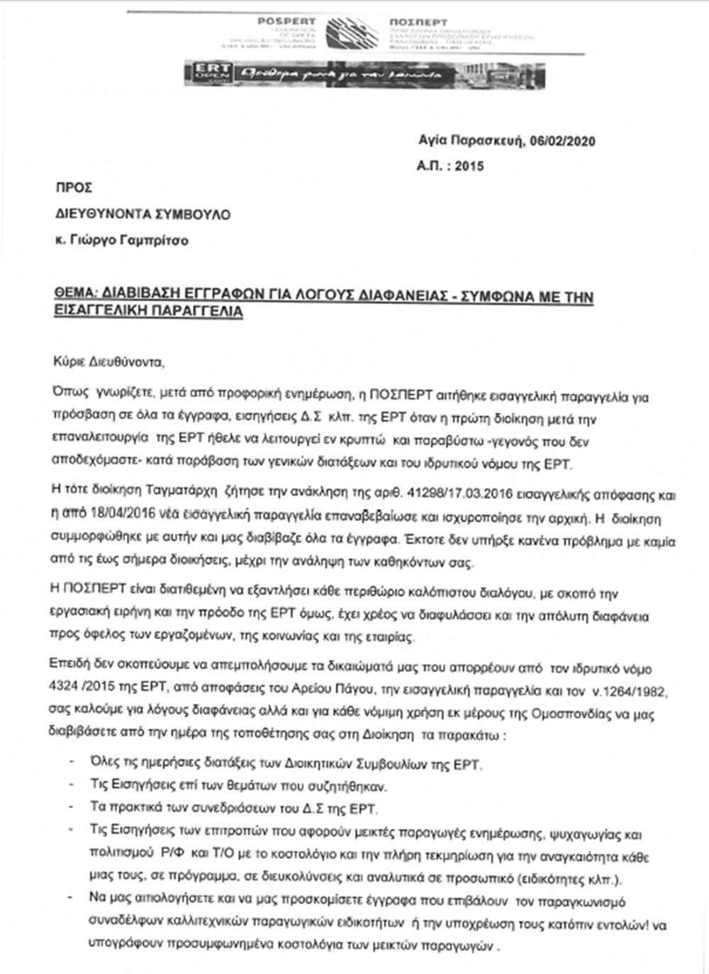 06/02/2020, να διαβιβάζει στην ΠΟΣΠΕΡΤ τα έγγραφα, τις εισηγήσεις, τις αποφάσεις,